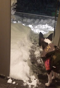 大雪で散歩もいけず、玄関から雪をながめていました。